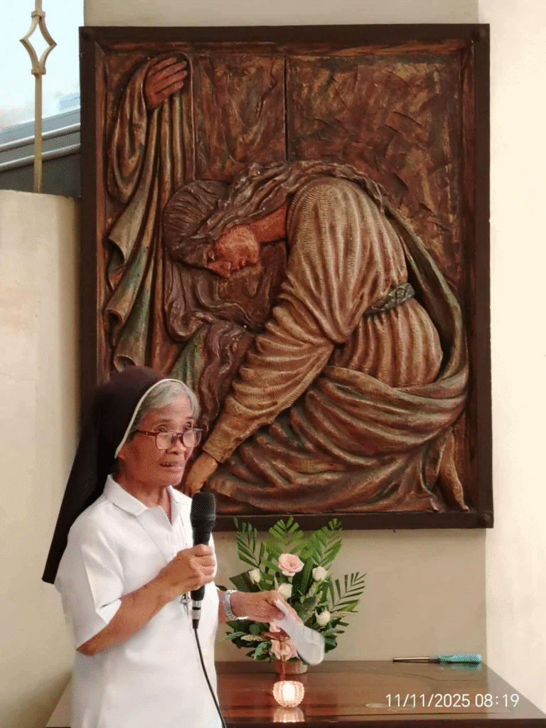 Meanwhile in Quezon City, the unexpected presence of Sr. Imelda Santos, unable to fly back to Virac, made the celebration more personal and meaningful. After Mass, the sisters and some partners in mission visited the former house of the first contemplative community, built in 1961 and now occupied by the Oblates of Mary Immaculate. The sculpted image of Mary Magdalene, still intact on the parlor wall, became a symbol of rooted identity.